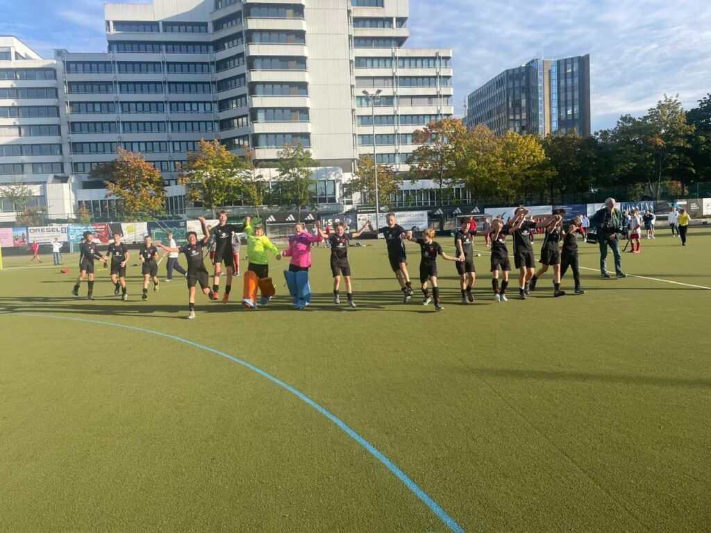 Erwartungsgemäß kam der DHC mit viel Schwung aus der Pause und versuchte den DSD-Abwehrriegel um Jasper, Raphael, Leo und TW Oskar zu knacken. Doch immer wieder hatten die DSD-Jungs einen Schläger dazwischen und gewannen wichtige Zweikämpfe. Es entwickelte sich ein ausgeglichenes Spiel mit vielen Duellen im Mittelfeld. Der DHC versuchte, den Druck zu erhöhen und kam auch zu der ein oder anderen Chance, aber alle DSD-Jungs blieben konzentriert und wurden zudem lautstark vom rot-schwarzen Anhang unterstützt. Leo kurbelte aus dem defensiven Mittelfeld heraus immer wieder das Spiel mit langen Bällen an, so dass die DSD-Stürmer zu Konterchancen kamen, die sie aber ungenutzt ließen. Als anderthalb Minuten vor Schluss auf Strafecke für den DSD entschieden wurde, war klar, dass sich der DSD den Sieg nicht mehr nehmen ließe. So spielten die DSDer die restlichen Sekunden clever herunter. Mit dem Schlusspfiff bildete sich schnell eine Spielertraube aus den ganz in schwarz gekleideten DSD-Jungs, die ihren bisher größten Erfolg gemeinsam feierten.