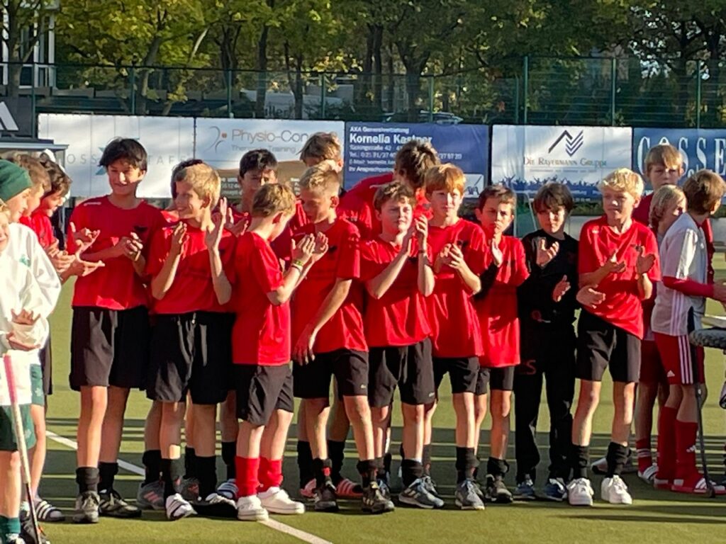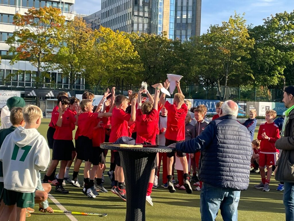 Bei der nachfolgenden Siegerehrung erhielten die Jungs dann ihren verdienten Siegerwimpel aus den Händen des WHV-Landestrainers. Platz 3 ging an Rot-Weiß Köln durch ein 3:2 gegen Uhlenhorst. Einen großen Dank geht an den DHC für eine stimmungsvolle Ausrichtung bei herrlichem Herbstwetter. Die erste westdeutsche Meisterschaft der MU12er seit dem Gewinn durch Holger Jungs vor 12 Jahren ist das Ergebnis kontinuierlicher Arbeit des Trainerteams um Tobi Bergmann, Len Lucas und Sebi Uhr. Hervorzuheben ist eine sehr geschlossene Mannschaftsleistung, die von der spielerischen, technischen und kämpferischen Breite aller Jungs lebt. Einen ganz besonderen Dank geht an den lautstarken Support durch Eltern, Großeltern, Geschwister sowie vieler DSD-Anhänger aus den verschiedensten Altersklassen, die die Jungs das gesamte Wochenende toll unterstützt haben.